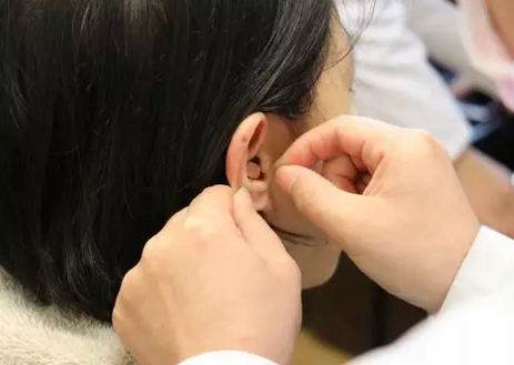 (健康管理師為企業(yè)員工貼耳穴)