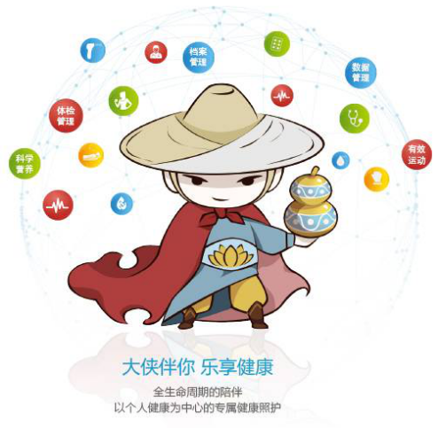 俠之大者,為國(guó)為民。醫(yī)之大者,初心不改。“大俠健康”以大俠、葫蘆、蓮花為設(shè)計(jì)元素,看似費(fèi)解,實(shí)則別有深意,傳遞出其品牌價(jià)值。大俠寓指具有健康超能量的武林高手,大俠手里的寶葫蘆借指隨身必備的健康錦囊,大俠胸前的蓮花所指慈悲之心,“大俠健康”整體寓指希望創(chuàng)建一個(gè)具有超常技術(shù)創(chuàng)新、復(fù)合專業(yè)能力、富有醫(yī)學(xué)人文情懷的個(gè)人健康專屬平臺(tái),以懸壺濟(jì)世之宏愿,聚焦大眾健康狀態(tài),托寶葫蘆“方”到病除,為普通民眾健康保駕護(hù)航,做人人可及的健康普適服務(wù),愿人們樂享健康生活。
